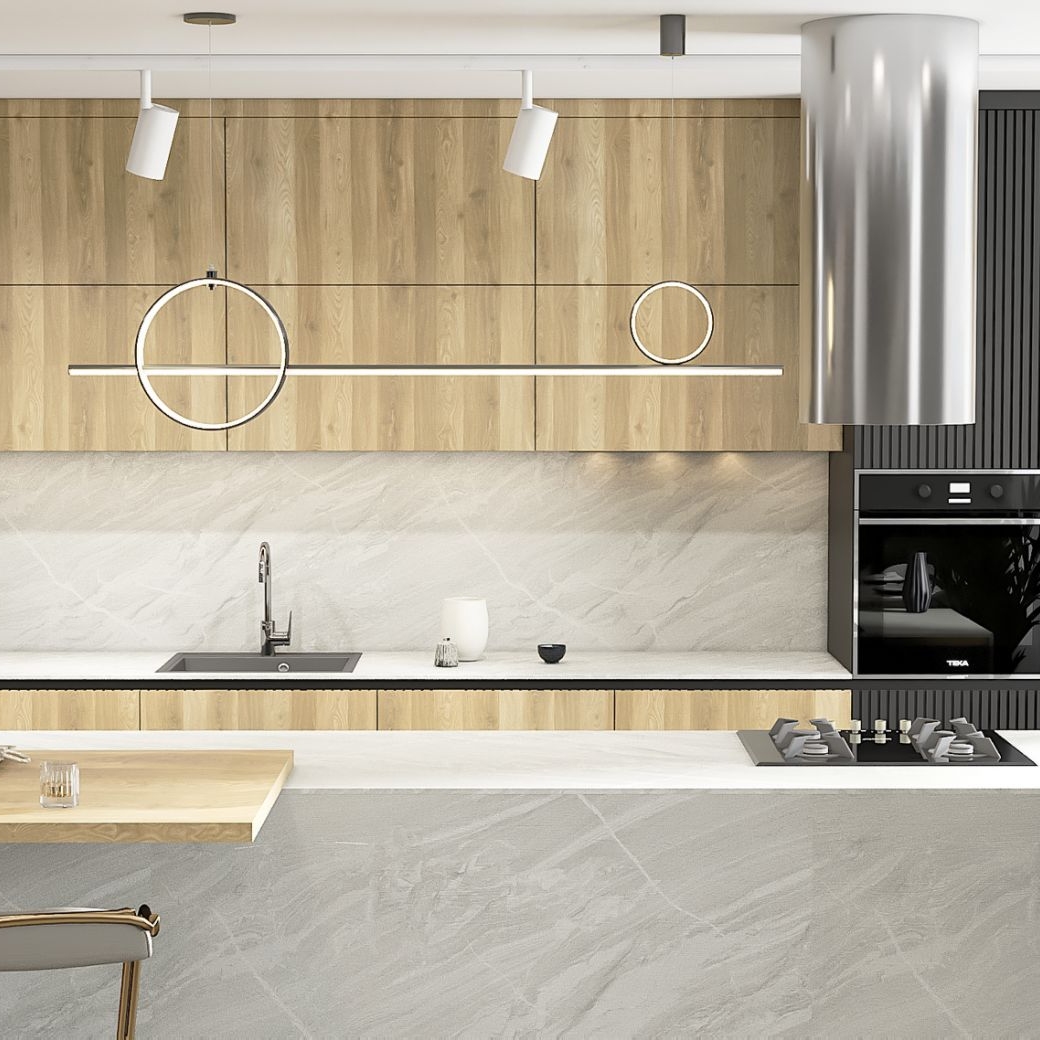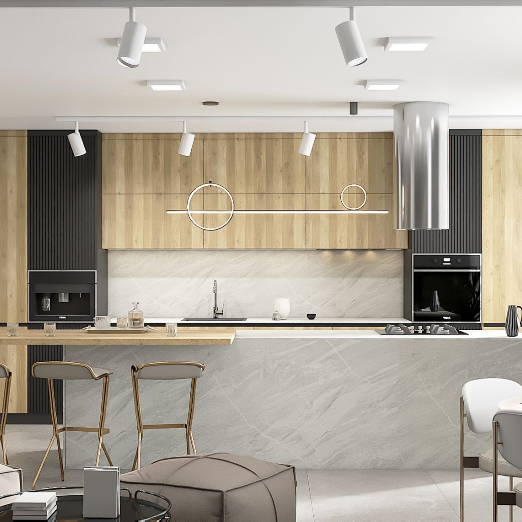 Kitchen with SM'art C005 Club Cricket chipboard facades in combination with corrugated MDF painted according to the RAL 9005 palette and SM'art CA04 Iceberg Canyon Compact Laminate worktop, made to order in a modern style. It is a unique design solution. The furniture is finished in a pristine wood and black, with hollow handles and built-in LED lighting for the cooking area, giving it a sleek, ergonomic and attractive look. This custom kitchen adds charm and an air of sophistication to any living space.