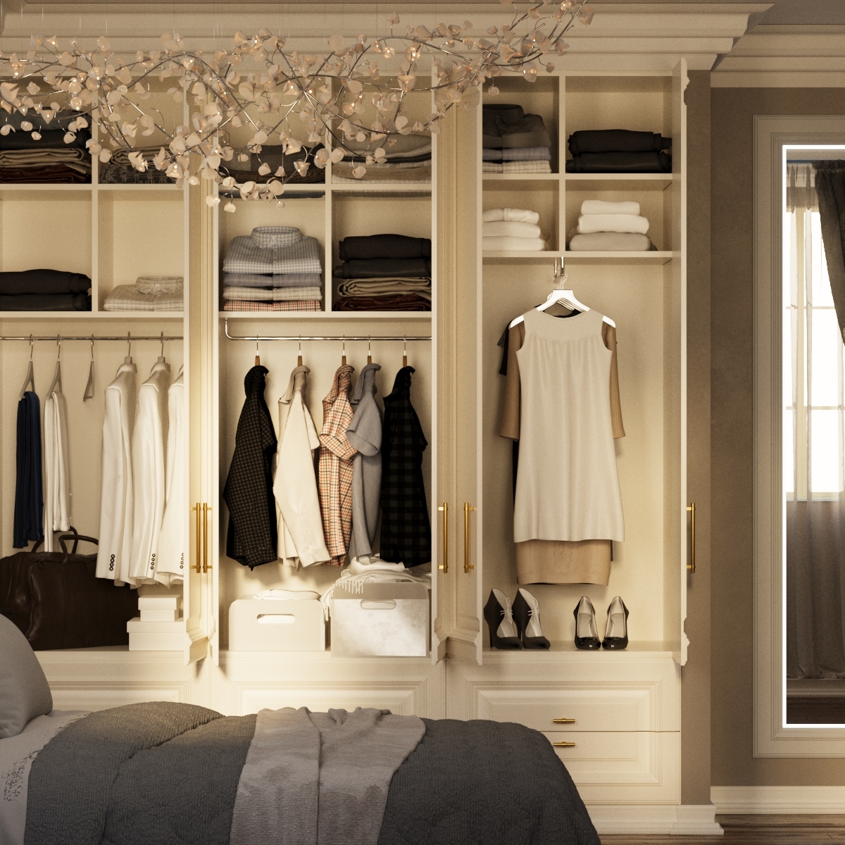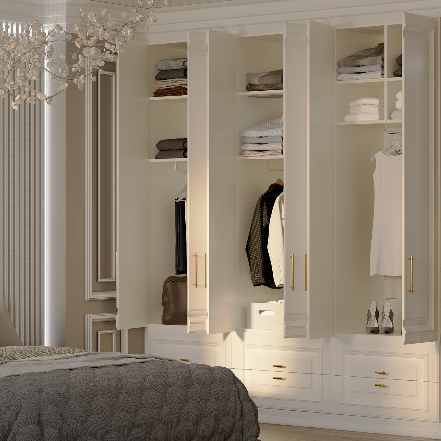 *The most affordable price in the description is the lowest amount for which you can purchase this wardrobe model, keeping the original shapes and textures. Only the type of material, supplies, organizers and light changes!