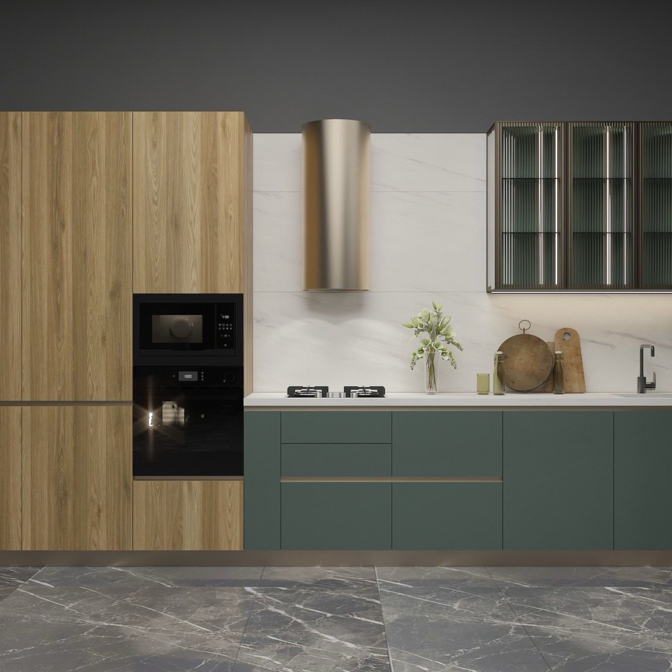 Bucătărie cu fasade din PAL SM'art C003 Club Polo în combinație cu MDF Supramat 3027 Forest Green și blat din Pal Egger F812 Marmură Levanto Alb, realizată la comandă în stil modern. Este o soluție de design unică dintr-o combinație de materiale lemnoasă și verde. Mânerele sunt de tip gola și led încorporat pentru iluminarea zonei pentru gătit, conferind un aspect elegant, ergonomic și atrăgător. Această bucătărie personalizată adăugă farmec și un aer de rafinament oricărui spațiu de locuit.