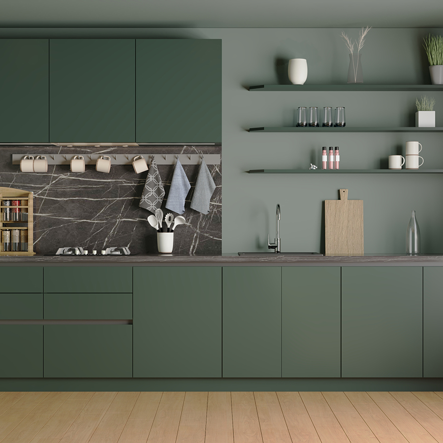 Materialele din care este creată această bucătărie sunt: MDF AGT Leaf Green - fațadă, PAL Melaminat Egger Pietra Grigia Negru F206 ST9 - blat. Bucătăria această prezintă minimalismul în toată spledoarea lui, neavând un surplus de dulapuri ce posibil ar putea chiar să nu fie folosite, astfel oferind un surplus de spațiu liber ce crează o suprafață liberă pentru decoruri. Modelul e unicat, și poate fi creat la comandă în același stil și cu aceleași materiale menționate mai sus.Vă puneți întrebarea dacă veți fi mai deosebit și neobișnuit? Puteți fi siguri că chiar așa și va fi, fiindcă culorile verzi- surii reamintesc de liniștea pădurii, vă rămâne doar să adăugați suntetul corespunzător. Mobilierul are mânere de tip Gola C și led încorporat în carcasă pentru iluminarea zonei pentru gătit onferind un aspect elegant, ergonomic și atrăgător. Bucătăriile personalizate mereu au adăugat un farmec și un rafinament, fiind realizate la comandă conform cerințelor clienților, iar acest model ar putea fi o machetă/schiță pentru noua dumneavoastră bucătărie .Textura materialelor, verde-suriu și negru curat sunt într-o ambianță mai neobișnuită, astfel amintindu-vă plăcerea momentelor petrecute într-o ambianță asemănătoare în natură,iar senzațiile plăcute apar chiar din momentul în care ați intrat în bucătărie.