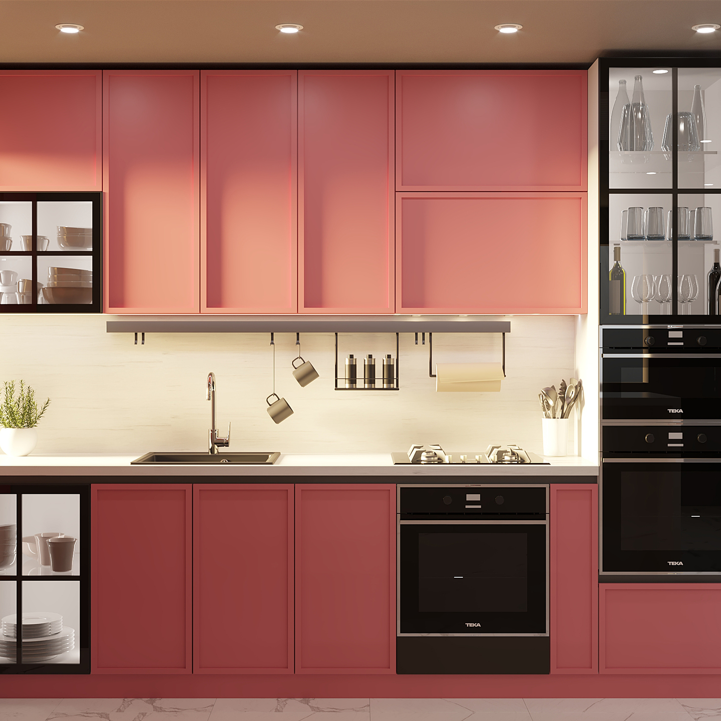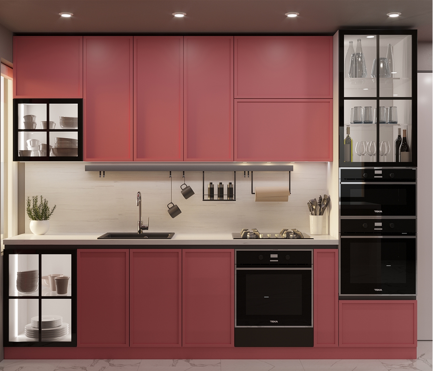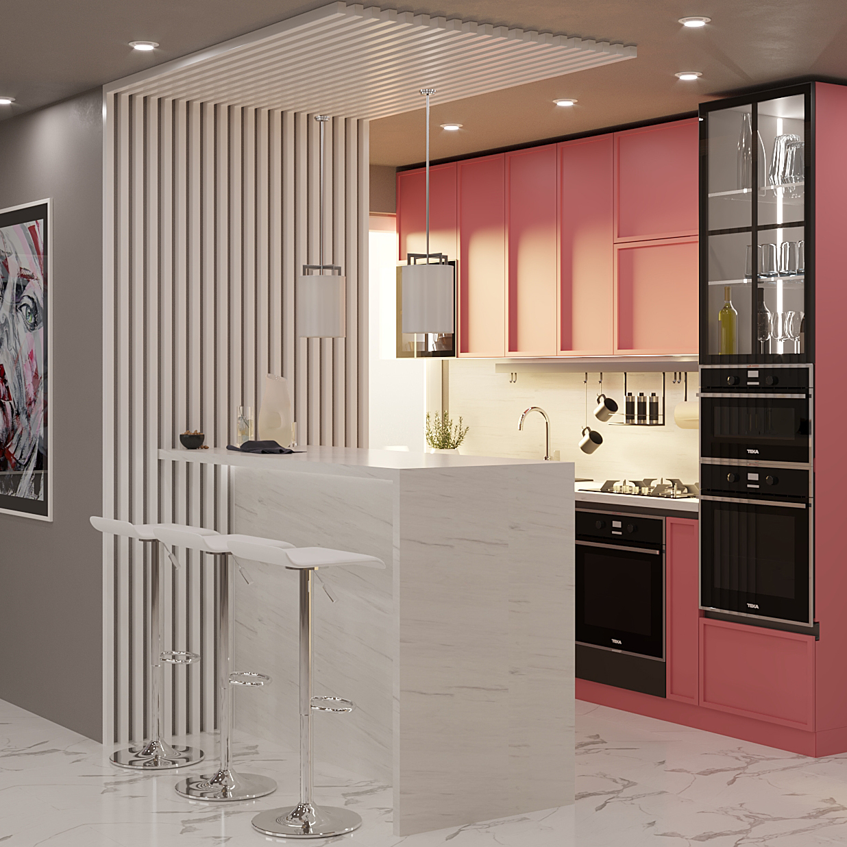 O bucătărie în stil neoclasic cu materiale pentru fațadă din MDF RAL 3014 și alb-suriu EGGER F812 pentru blat, furnitura e produsă de către Hettich. Această bucătărie poate fi o alegere elegantă și atemporală. Stilul neoclasic se caracterizează prin eleganță și simetrie. Acesta îmbină elemente clasice, precum ornamentele decorative și formele simetrice, cu linii mai curate și moderne. Fiți siguri că designul bucătăriei respectă aceste caracteristici și armonia persistă în restul casei tale. Nuanța de roz este o alegere mai deosebită pentru fronturile de bucătărie în stil neoclasic. Aceasta oferă o bază mat și poate fi combinată cu detalii și accente în culori pastelate sau neutre, spre exemplu albe,gri sau verde pastelat. Aceste nuanțe adaugă caldura și profunzimea necesară într-o bucătărie dacă o doriți mai neobișnuită și deosebită.