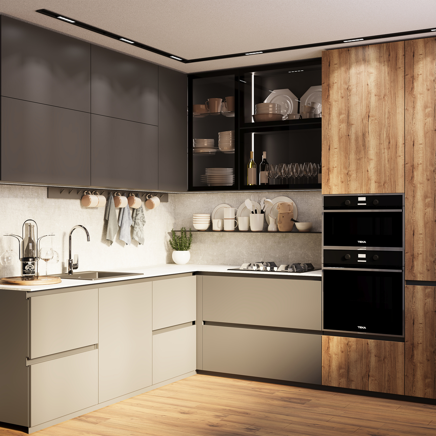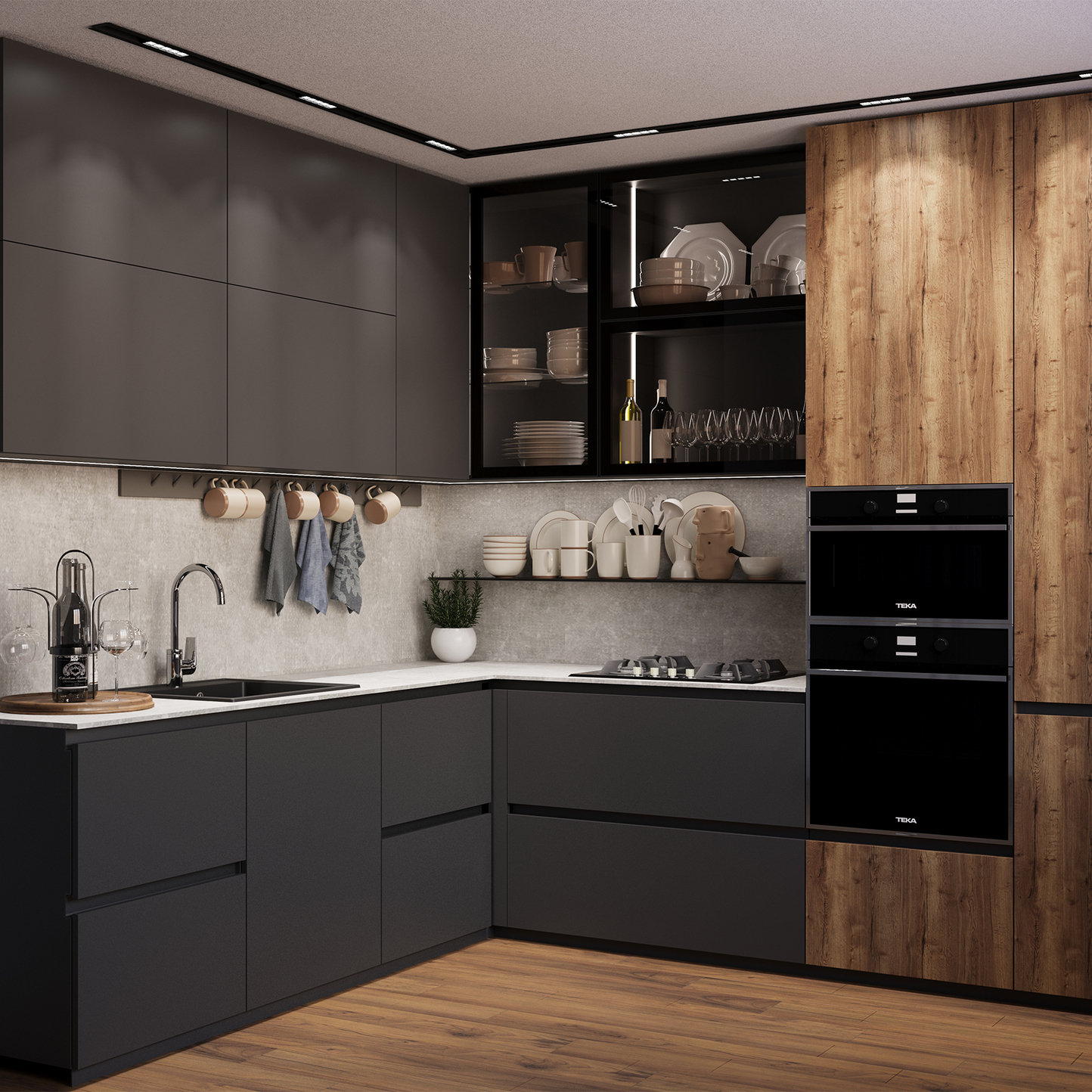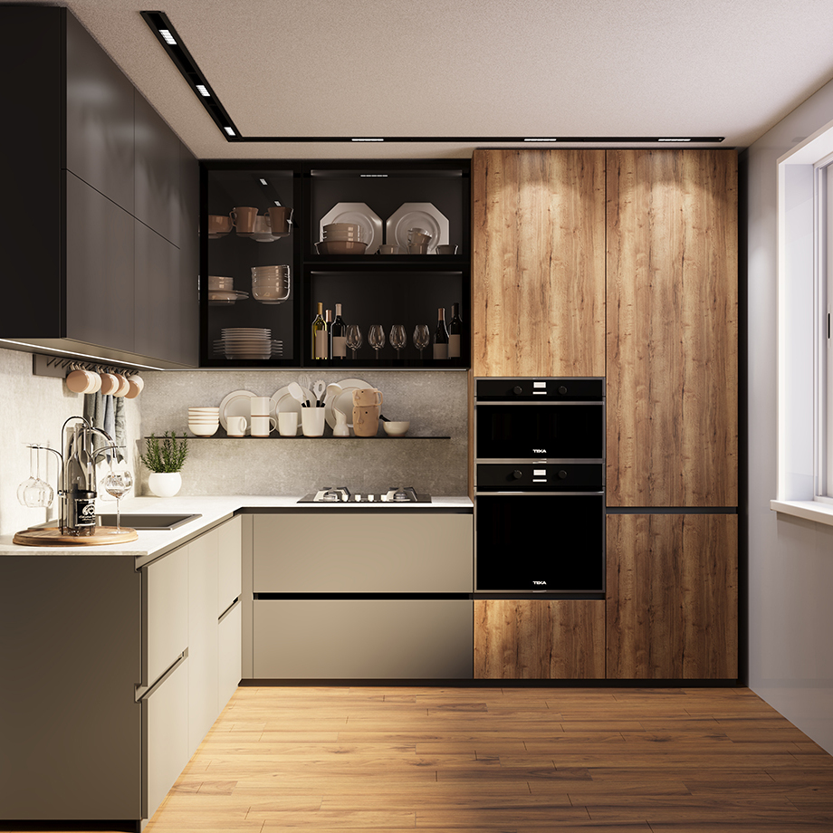Loft - fiind un trend în designul interior, a avut originea în sfârșitul secolului XX, în zona industrială a orașului Manhattan. Stilul loft permite o combinare celor mai moderne gadgeturi cu pereții vechi din cărămidă, scânduri si felinare industriale, dar în ultima perioadă, evoluând și a creat posibilitatea de a fi confundat cu stilul modern și neoclasic.Designul acestei bucătării prezentând un loft neutru în negru, sur și textura lemnului, crează posibilitatea de a admira această combinație între stiluri, fiind creată din material PAL pentru fasadă și uși, iar HPL e folosit pentru blat și contrablat, oferind o siguranță la rezistența în timp de primă clasă printre materialele fabricate de om. Carcasa și fațada vitrinelor sunt din metal, iar polițele sunt separate cu material din sticlă, oferind o vizualizare completă concomitentă a ceea ce se află în interior.