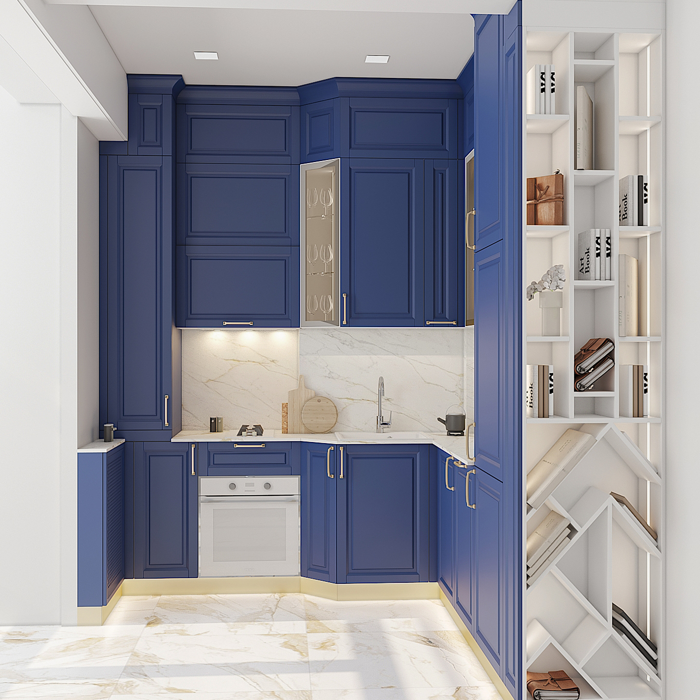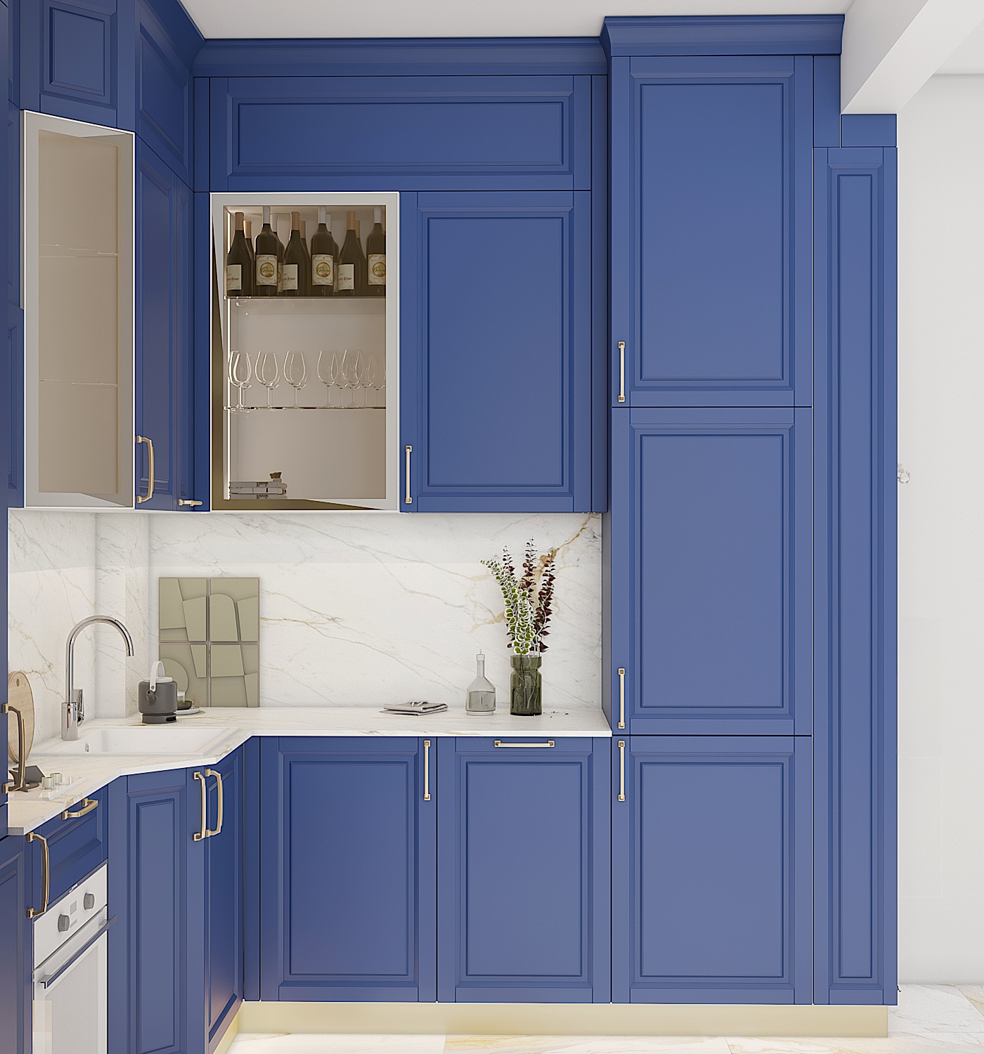 O bucătărie în stil clasic oferă valoare imobilului dar și valoare psihologică în fața propriei persoane. O bucătărie clasică în culori albăstrui închise, atrage atenția prin nuanța neobișnuită ce a fost folosită în prezentarea gusturilor proprietarului precum și a sufletului curat ca cerul senin. Această bucătărie poate fi creată la comandă și a fost calculată să se includă perfect chiar și într-o bucătărie cu spațiu limitat, concomitent avînd și o vitrină pentru un decor corespunzător gusturilor, cerințelor și dorințelor dumneavoastră. Fasada e creată în totalitate din MDF frezat și vopsit, astfel uzoarele vor avea o rezistență mai mare la umezeală în timp și va fi ușor de întreținut. Blatul e creat de către compania germană Egger, iar furnitura este de calitate superioară, producătorul fiind compania austricacă BLUM.