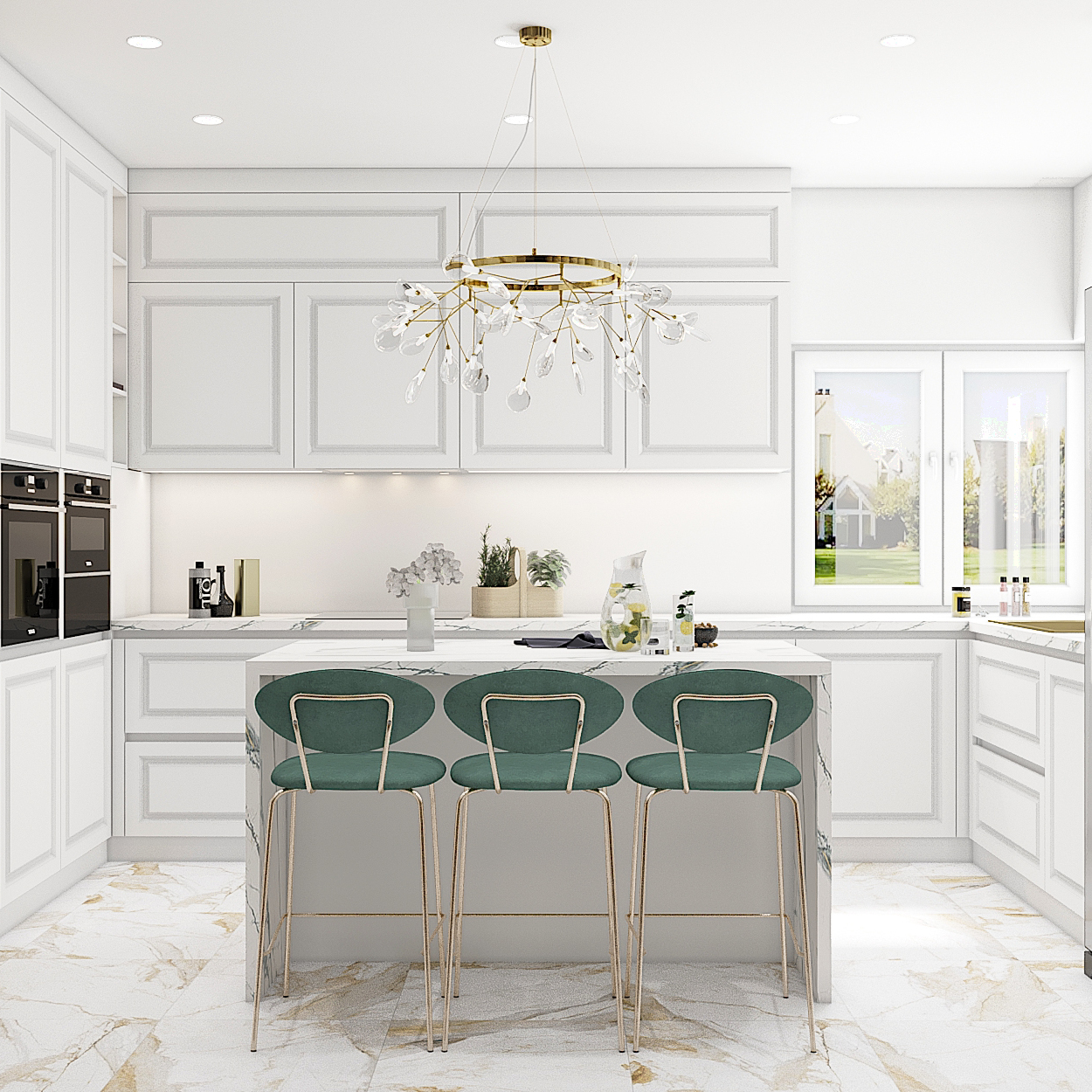 O bucătărie clasică, cu interior la fel de spațios ca și aceasta, ce include concomitent și o insulă cu suprafața mai mare, crează o zenzație de statut material, emoțional și fizic, fiindcă o bucătărie în stil clasic e o alegere mai deosebită ce nu fiecare are taria de caracter să o aleagă, iar cei ce o fac, realizează faptul că pentru început, stilul îi oferă o valoare mai mare, după deja pot fi menționate și materialele din care a fost creată,.Acestă bucătărie în stil clasic, pentru a obține un preț mediu și și calitate înaltă, va fi creată din MDF frezat și vopsit pentru fațadă , blatul din PAL, iar furnitura este de producție austriacă Blum.