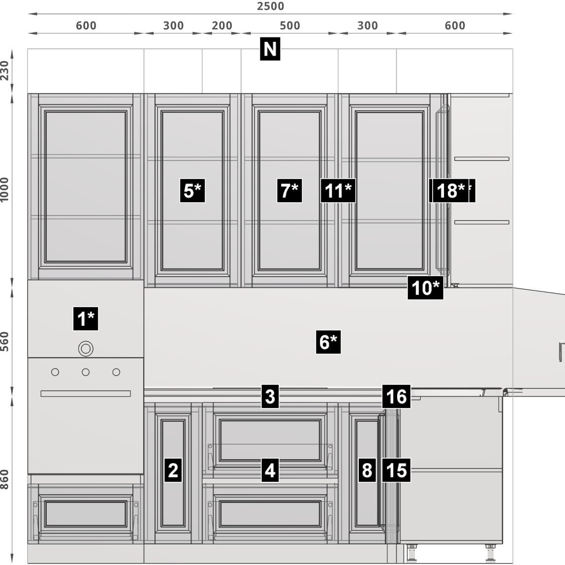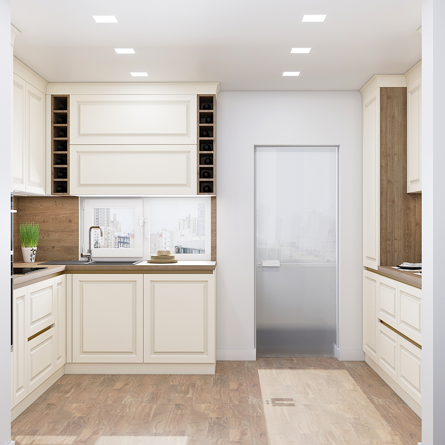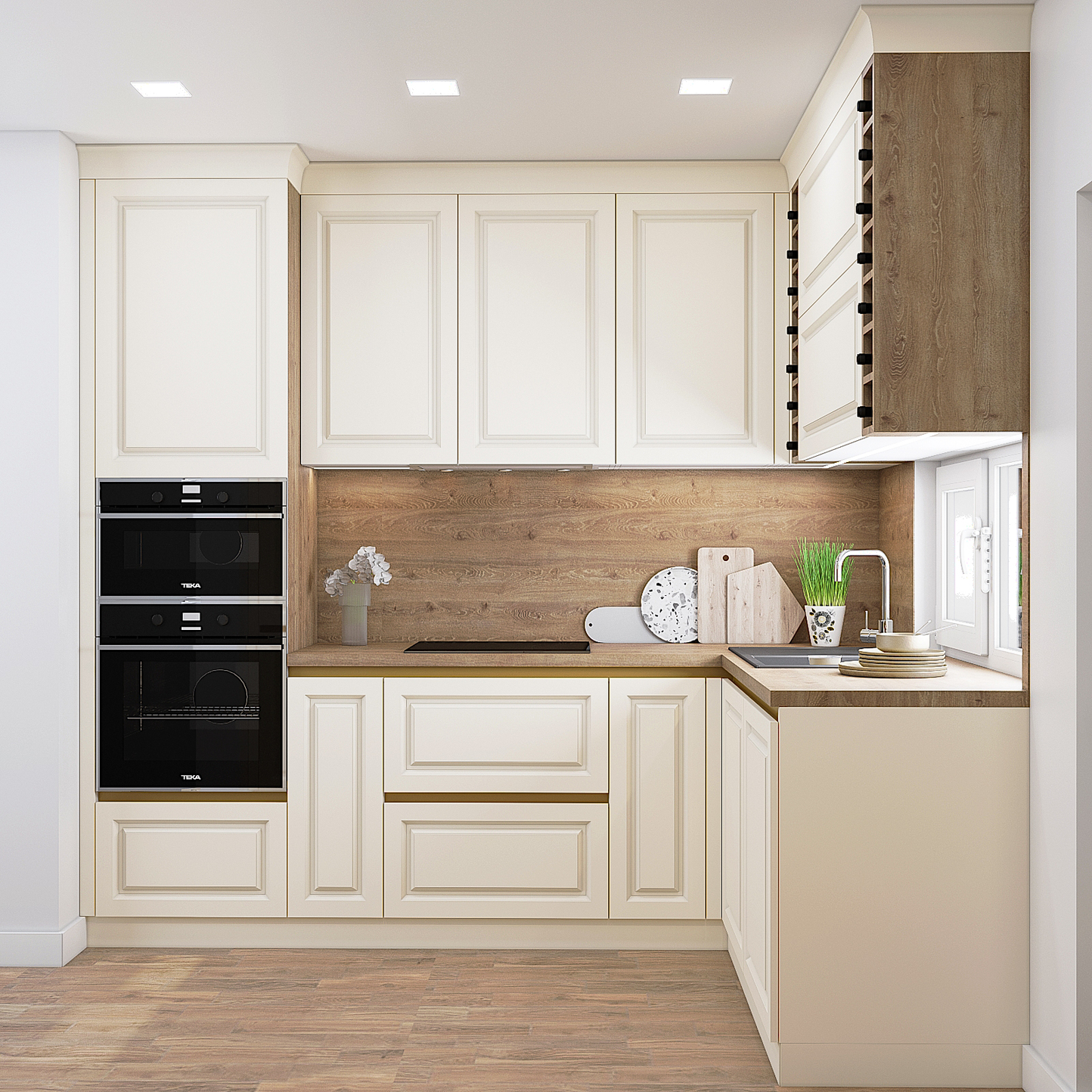 Stilul designului clasic, fiind mai deosebit, poate fi recunoscut din prima clipă, indiferent dacă încăperea e de dimensiuni mari sau mici. Bucătăria din acest model are dimensiuni reduse, aflându-se într-un apartament ce dispune cu un spațiu mediu pentru bucătărie, iar balconul este unit cu bucătăria, astfel creându-se destul spațiu pentru a plasa și o masă mai mare și totodată oferind un confort mai ridicat. Stilul clasic atrage atenția prin bogăția lui de elemente, curbe, detalii și culori, dar desigur, totul deja depinde de gusturile clientului și preferințelor lor. Materialul MDF vopsit pentru fațade oferă duritate și rezistență mai înaltă în timp, MDF-ul având rezistență ridicată chiar și la umiditate. Producătorul furniturii este compania Blum, ceea ce asigură o rezistență în timp și o varietate de mecanisme ce se pot deschide și închide automat.