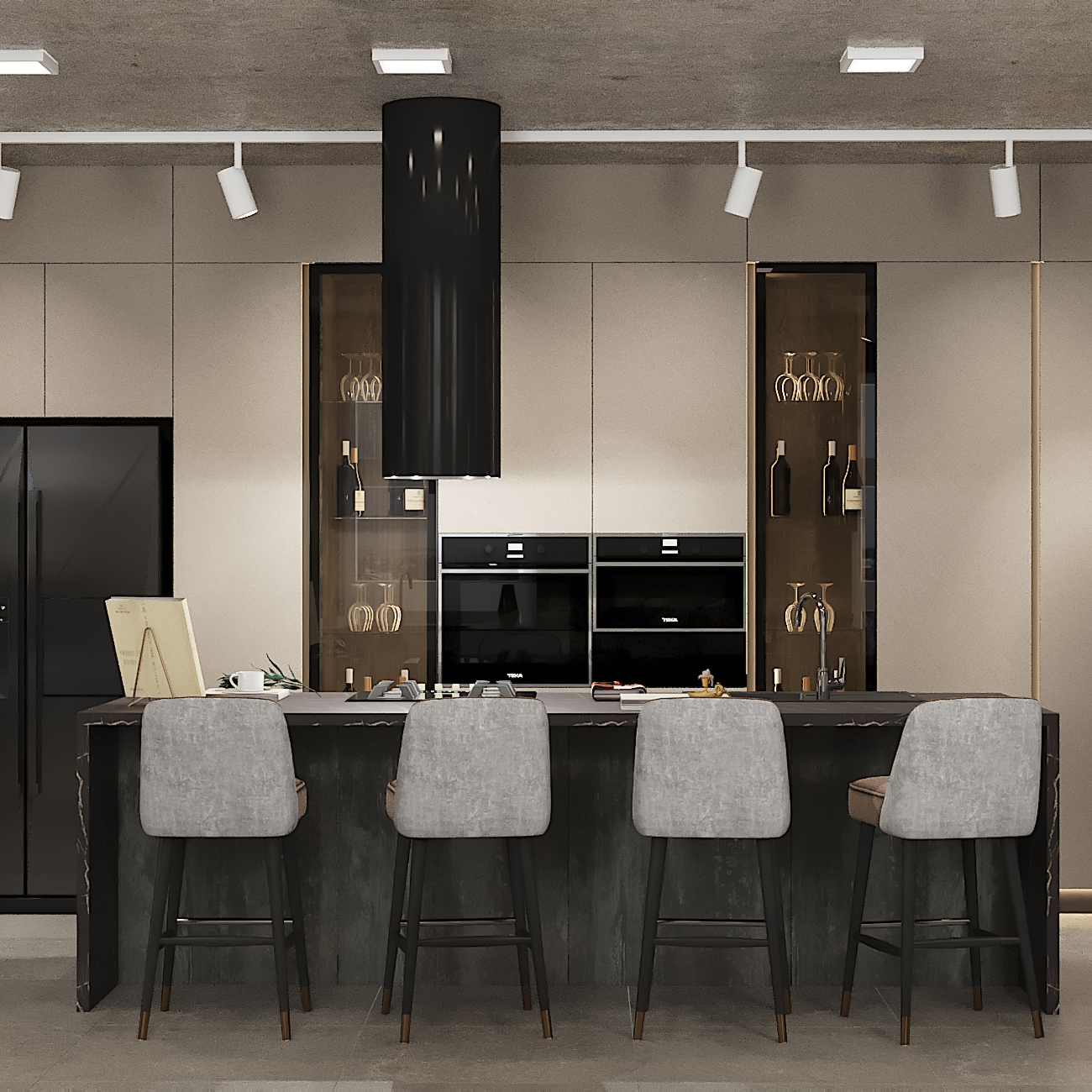 Кухня с фасадами МДФ AGT 387 MATT KASHMERE GREY в сочетании со столешницей SM'art U005 URBAN IRON PALM и столешницей из компакт-ламината SM'art OL04 OLYMPUS APOLLO, выполнена на заказ в современном стиле. Это уникальное дизайнерское решение. Мебель выполнена в нетронутых серых тонах и дереве, с полыми ручками и встроенным светодиодным освещением зоны готовки, что придает ей гладкий, эргономичный и привлекательный вид. Кухня, изготовленная по индивидуальному заказу, добавит очарования и изысканности любому жилому пространству.
