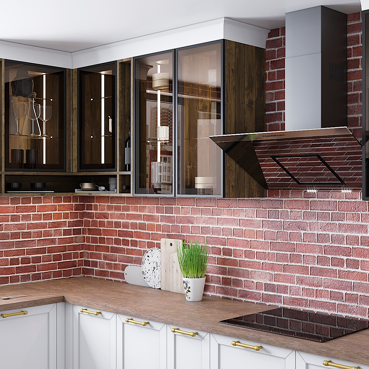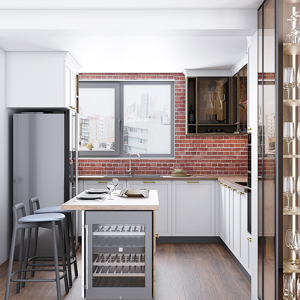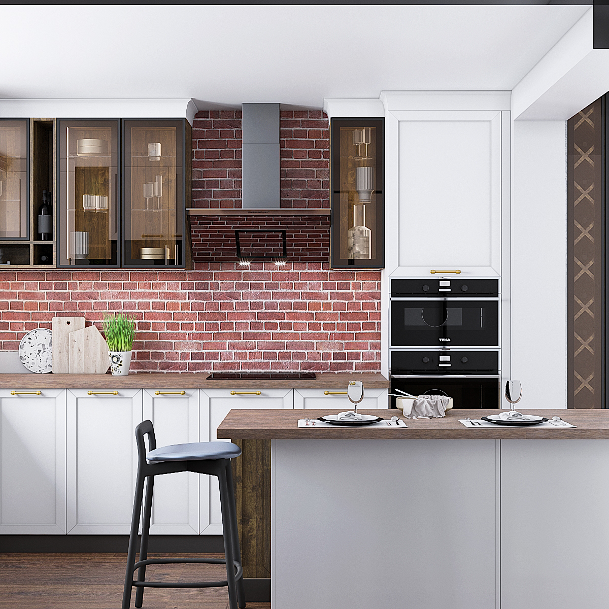 Цветовая гамма стиля лофт может быть нейтральной или контрастной, она задает цветовые акценты, разрешенные для аксессуаров или обивки, а также более особенную кухню, с яркими и насыщенными цветами, такими как зеленовато-белый, колбатно-синий, лазурный, желтый, темно-оранжевый и даже темно-красный. Но не будем забывать тот факт, что цвета, представленные на этой кухне, по-прежнему будут приветствоваться практически во всех стилях, поэтому этот полутемно-серый цвет в сочетании с фактурой дерева может создать приятную и спокойную атмосферу на кухне. Материалы, использованные в этой кухне: фасад из крашеного и потертого МДФ, столешница – Egger PAL, шкафы – Blum Modern Box.